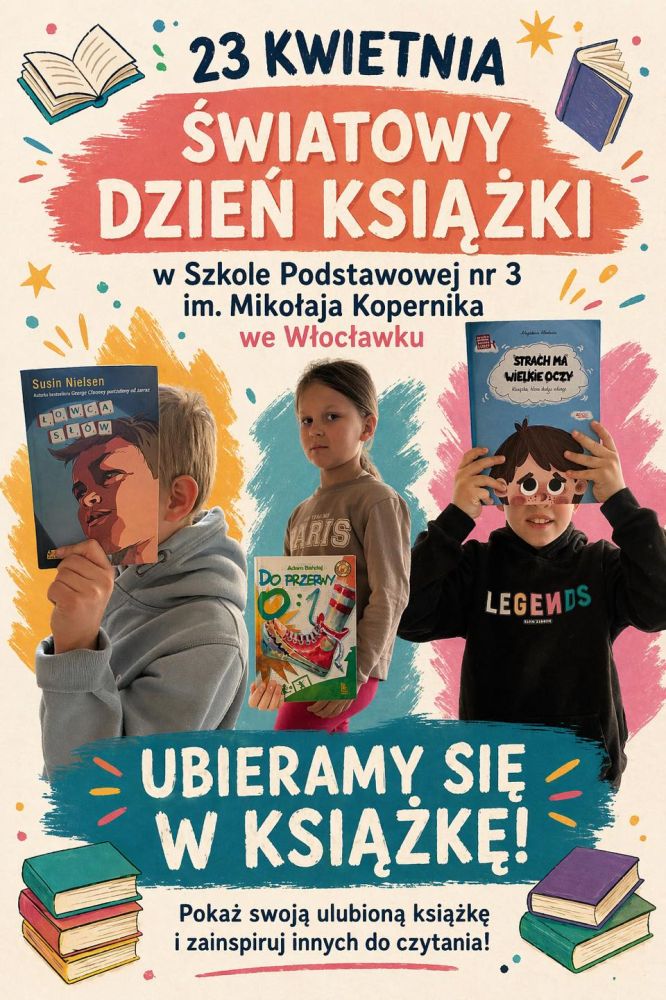 23 kwietnia obchodziliśmy ŚWIATOWY DZIEŃ KSIĄŻKI , uczniowie z zasłoniętą przez okładkę książki częścią ciała lub wkomponowanie okładki książki w otoczenie ubierali się w książkę. W efekcie powstawało złudzenie prezentujące czasem zabawne, czasem kreatywne połączenie osobowości czytelnika z jego książkowym wcieleniem.